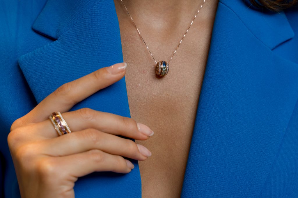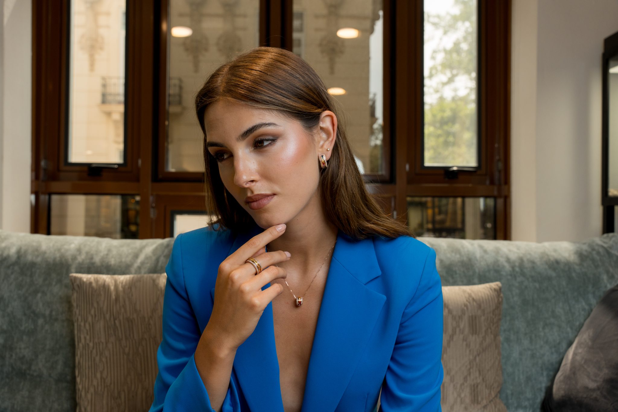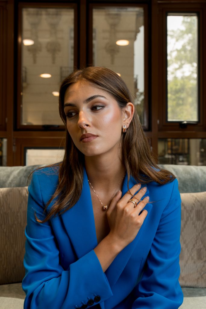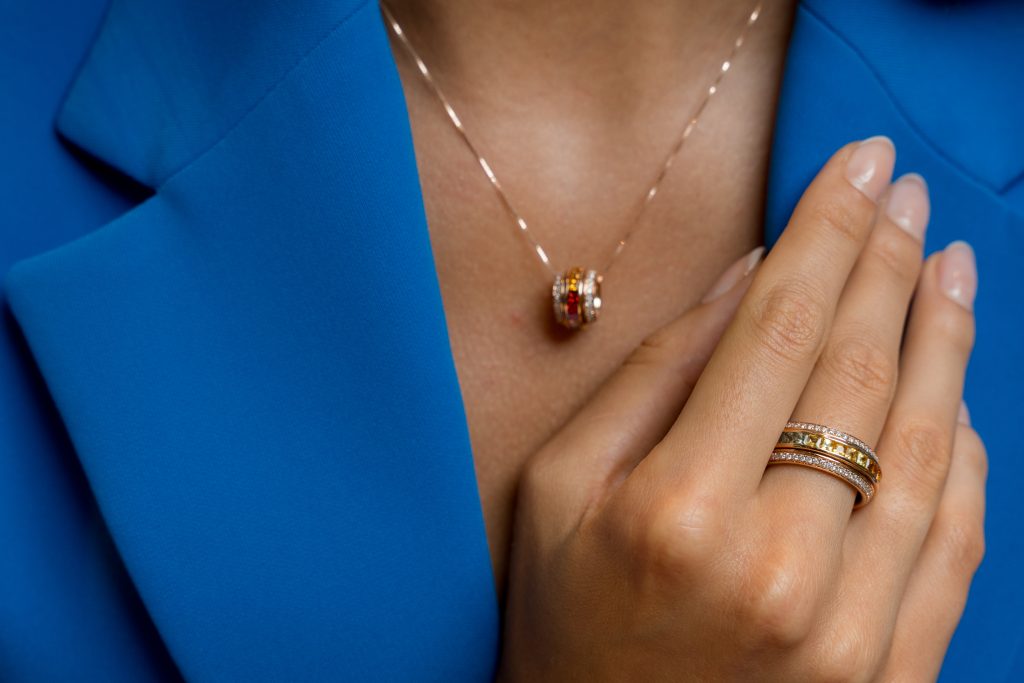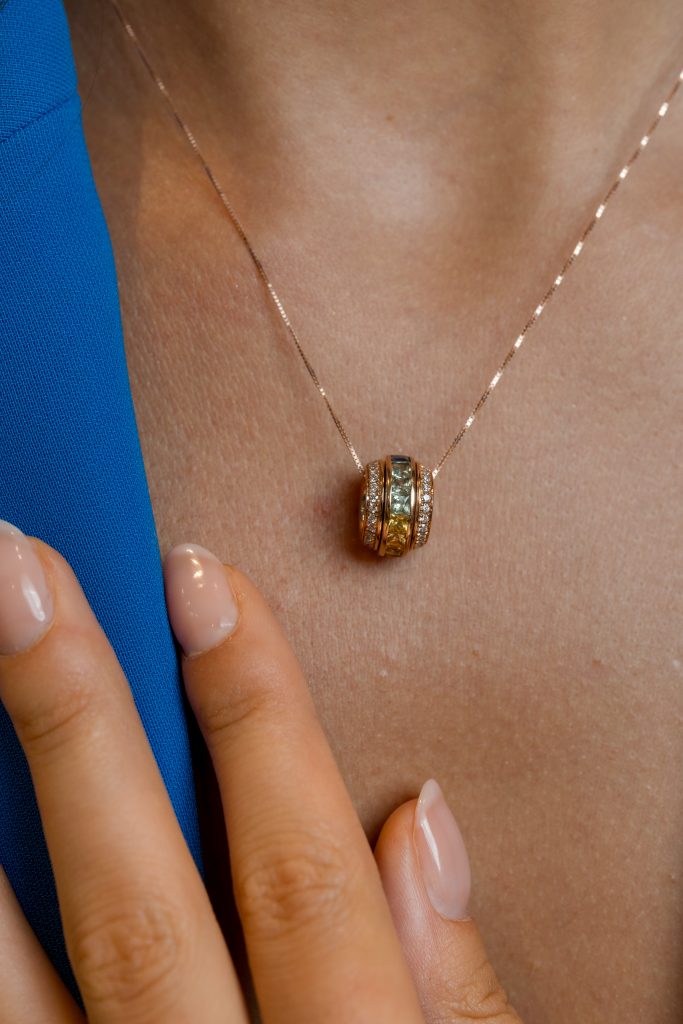 La pieza habla de ritmo, de fluidez, de tiempo que pasa sin ruido. El oro amarillo, como material cálido y estable, contrasta con la viveza del color y con el juego de luces del movimiento combinado de nuestro cuerpo con el de rotación de algunas de las piezas que componen la colección. Así, cada joya se convierte en una pequeña escultura móvil que combina orden, color y gesto.