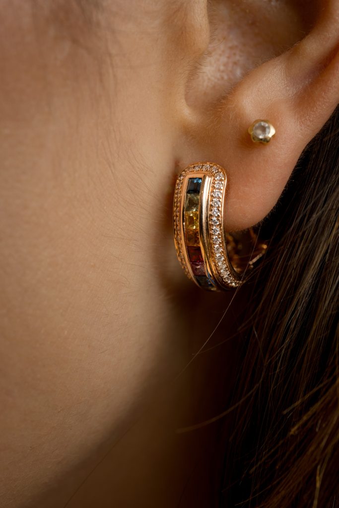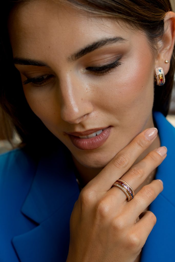 Usando el oro amarillo como base, y flanqueado por una banda de pequeños diamantes a cada lado, creamos un carril central móvil, giratorio, al que le vamos a engastar zafiros multicolor ordenados cromáticamente, pero piedra contra piedra, para que en ningún momento se pierda la transición de un color a otro y para que siempre podamos disfrutar del juego de colores. Cada zafiro ha sido seleccionado no sólo por su color, sino también por la transición que establece con la siguiente piedra, generando una secuencia armónica que luce su máximo esplendor en la rotación libre de ese carril a nuestro antojo. El resultado es una joya que va más allá de la mera función ornamental buscando que cada uno pueda expresarse mediante el juego de colores más acorde a su estado de ánimo. Y todo ellos lo hacemos añadiendo esa ambivalencia cinética: cada giro activa un juego visual de reflejos y tonos, y convierte al portador en parte del diseño, al decidir cuándo y cómo activar ese movimiento.