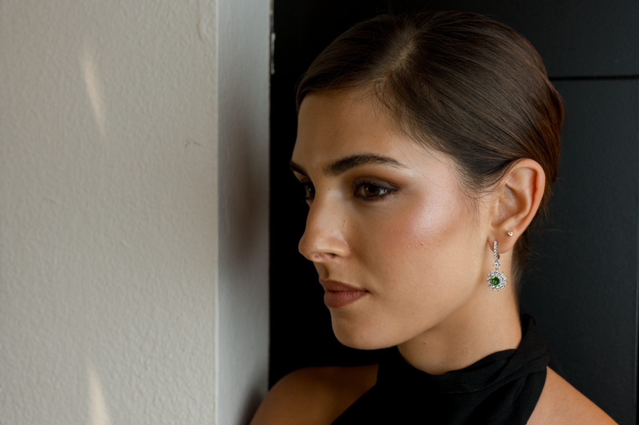 El sistema de cierre de ballestilla, acompañado por una línea de diamantes engastados en el aro, prolonga la luminosidad desde el lóbulo hacia el colgante, creando una transición de brillo continua. El diseño está concebido para provocar los más mínimos movimientos y así poder proyectar luz desde todos los ángulos, generando un efecto de destello constante.