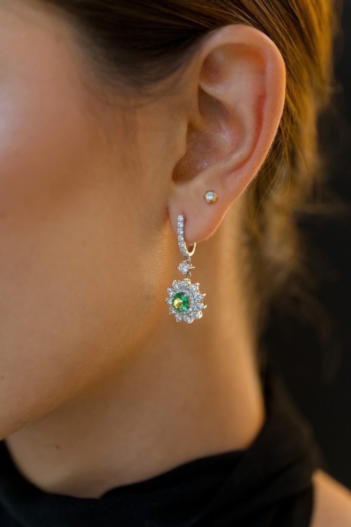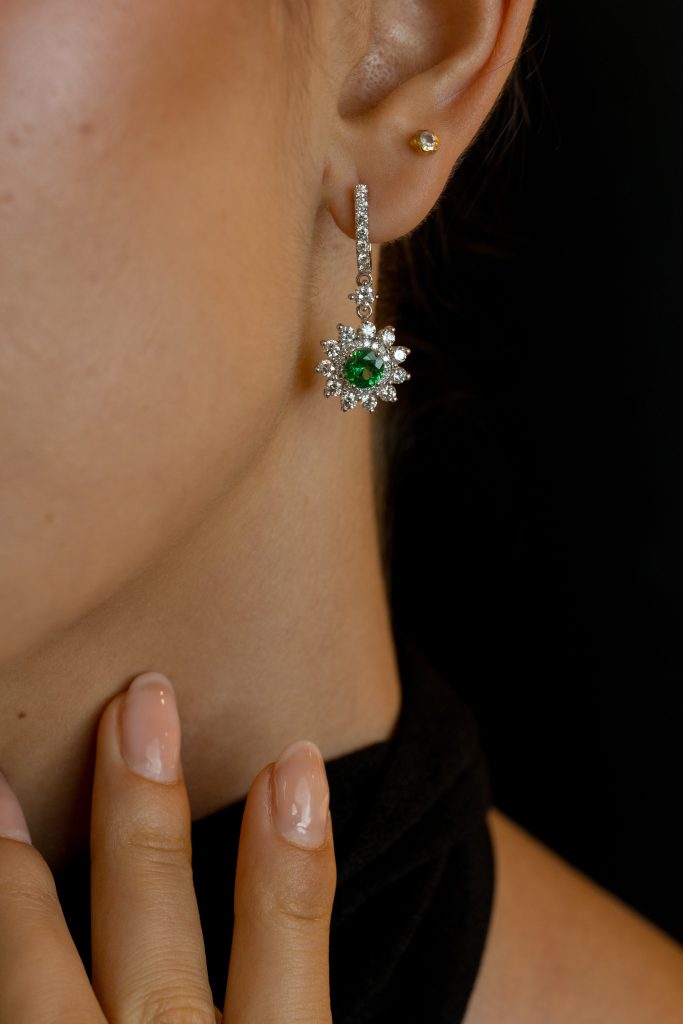 Estos pendientes surgen del estudio de la simetría radial en la naturaleza y del contraste entre el color puro y la luz blanca. El diseño parte de una estructura en oro blanco que acentúa el brillo de los diamantes y permite destacar el color verde intenso de las tsavoritas centrales. La disposición de las piedras reproduce un patrón radial inspirado en las formas estrelladas de ciertos cristales, con una piedra central redonda rodeada por una corona de diamantes engastados en garras.